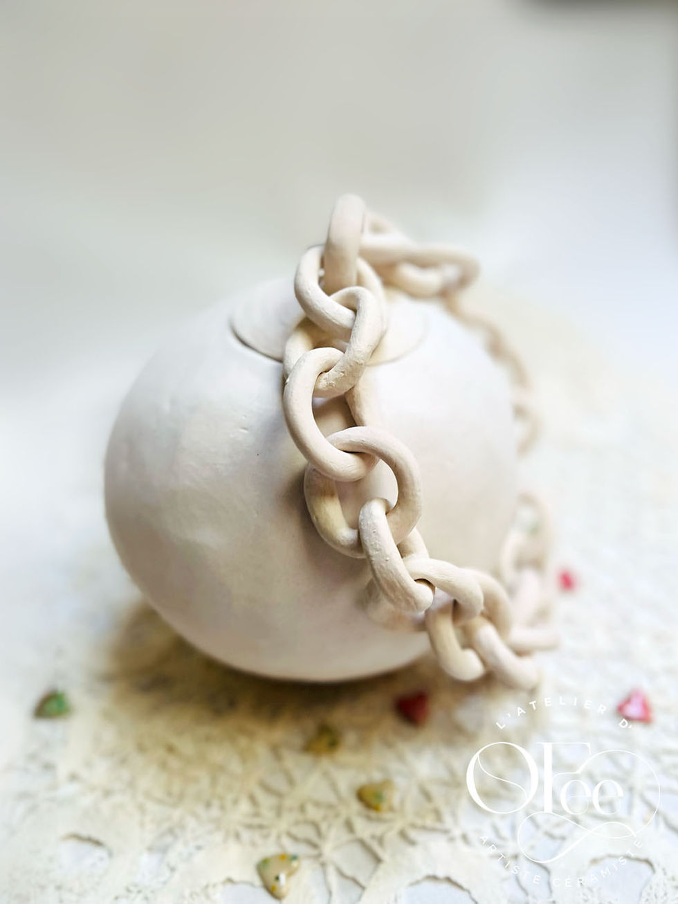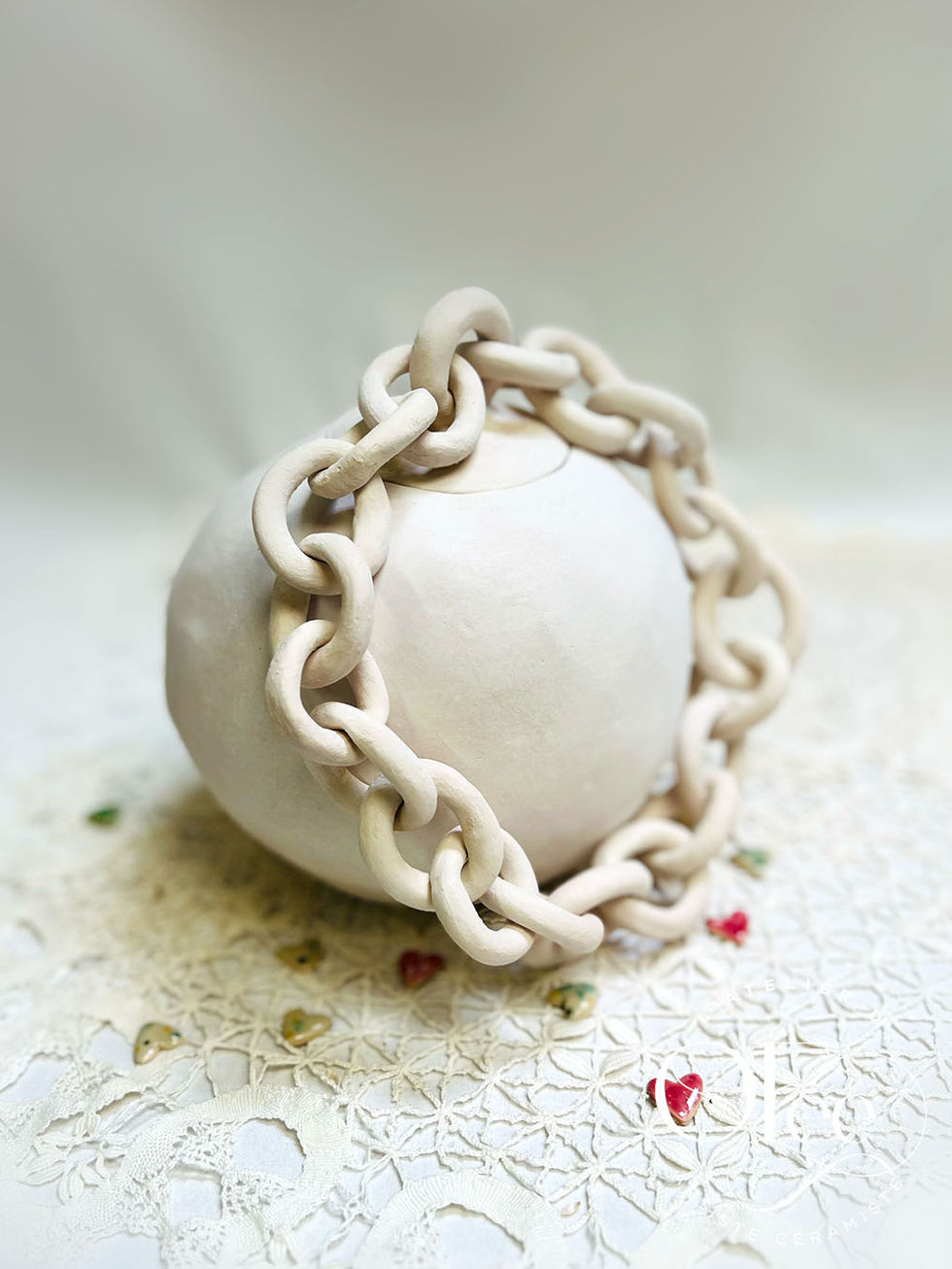 J'avais envie de créer quelque chose d'unique, qui défie les lois de la céramique traditionnelle. Mes mains ont d'abord façonné une plaque d'argile blanche à la croûteuse, puis modelé cette boule parfaite dans un moule. Mais le véritable défi commençait : sculpter cette chaîne maillon par maillon, chacun libre et mobile, taillé dans la masse avec une patience infinie. L'estèque creusait délicatement chaque anneau, l'éponge lisse caressait les formes pour leur donner cette douceur soyeuse.