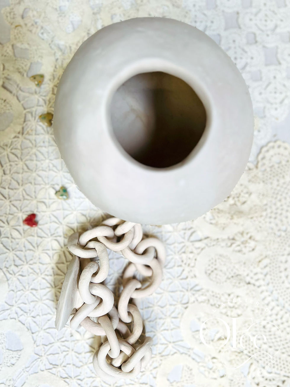 Quand l'argile blanche pure se pare d'une chaîne sculptée, liant l'élégance à l'authenticité brute...