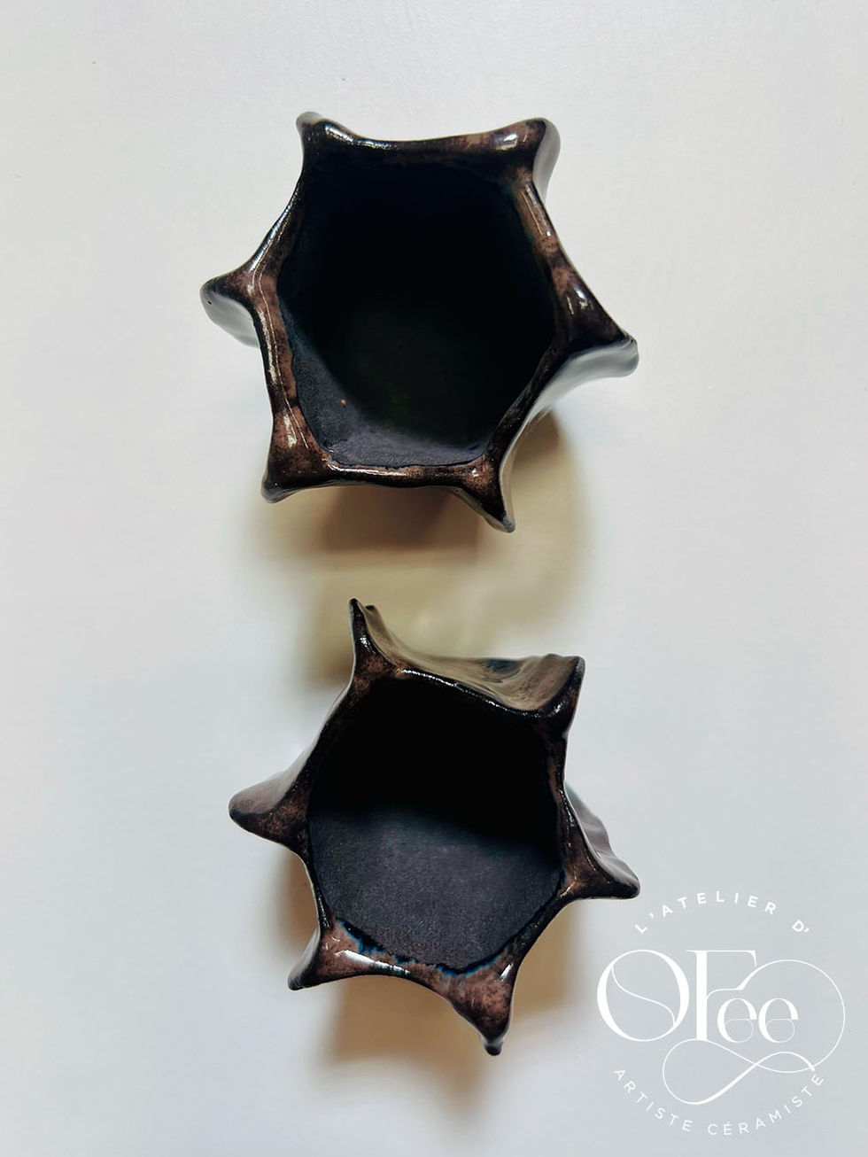Ces petits trésors sont nés d'une fascination pour les grottes sous-marines. L'odeur plus intense de l'argile noire emplissait l'atelier ce matin-là, et mes doigts ont retrouvé ce geste millénaire du pincé. Le contact plus dense sous mes pouces, cette terre qui résiste davantage et demande plus de patience... Puis cette évidence : les habiller de ce bleu grotte sombre, comme les reflets secrets des cavernes aquatiques.