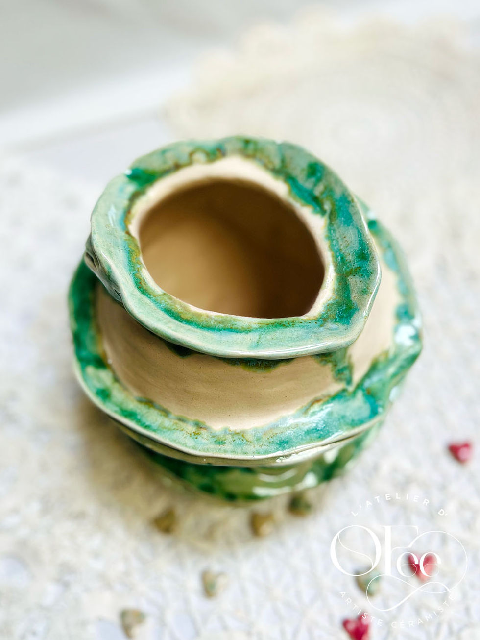 L'émail patine au pinceau a coulé comme une cascade verte sur ses flancs, créant ces coulures organiques si caractéristiques. Chaque passage du pinceau ajoutait une nuance, un reflet, une profondeur nouvelle. La seconde cuisson à 1000° a scellé cette alchimie, révélant enfin cette patine satinée aux reflets changeants.